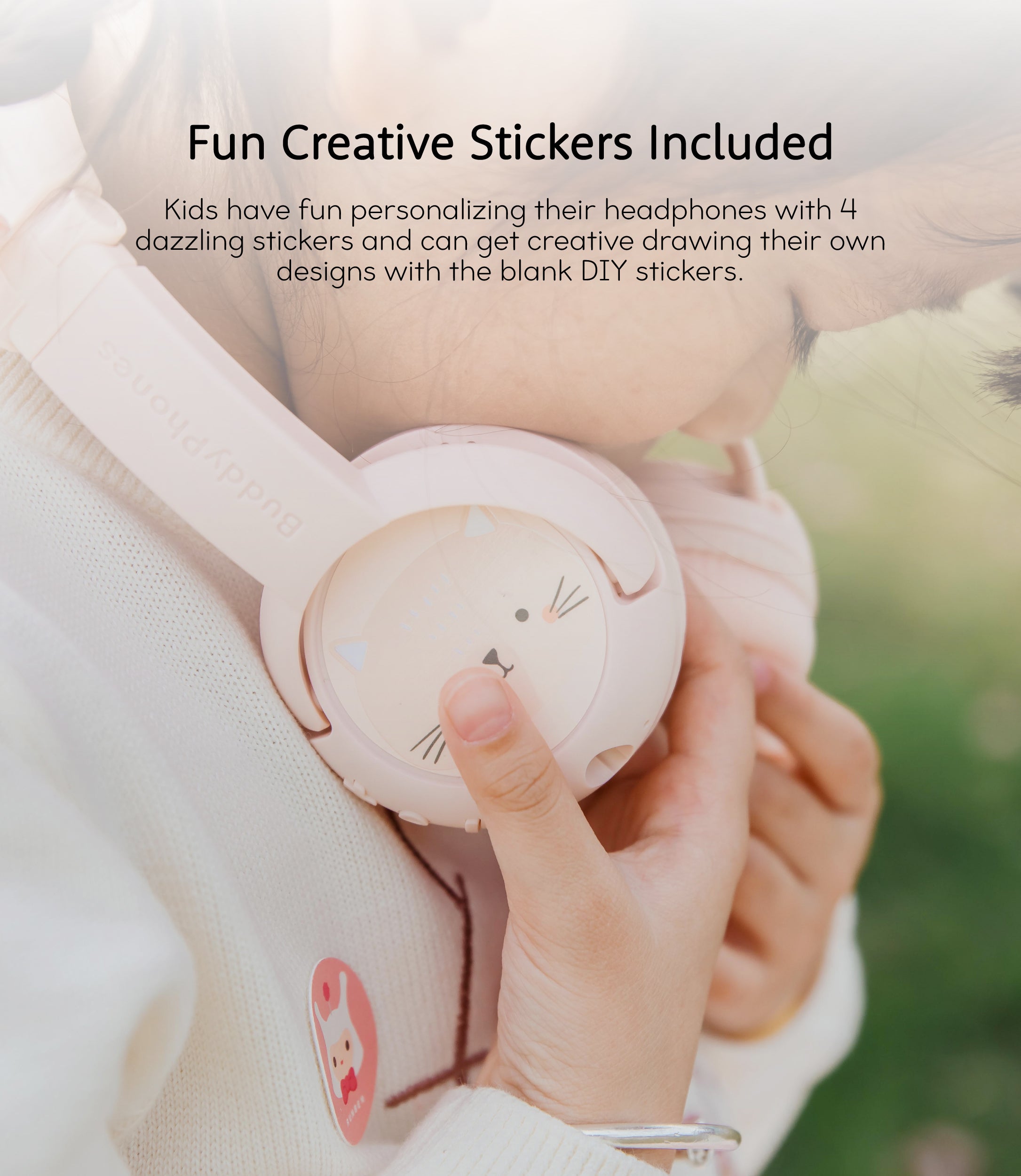Kids have fun personalizing their headphones with 3 dazzling stickers and can get creative drawing their own designs with the blank DIY stickers.
