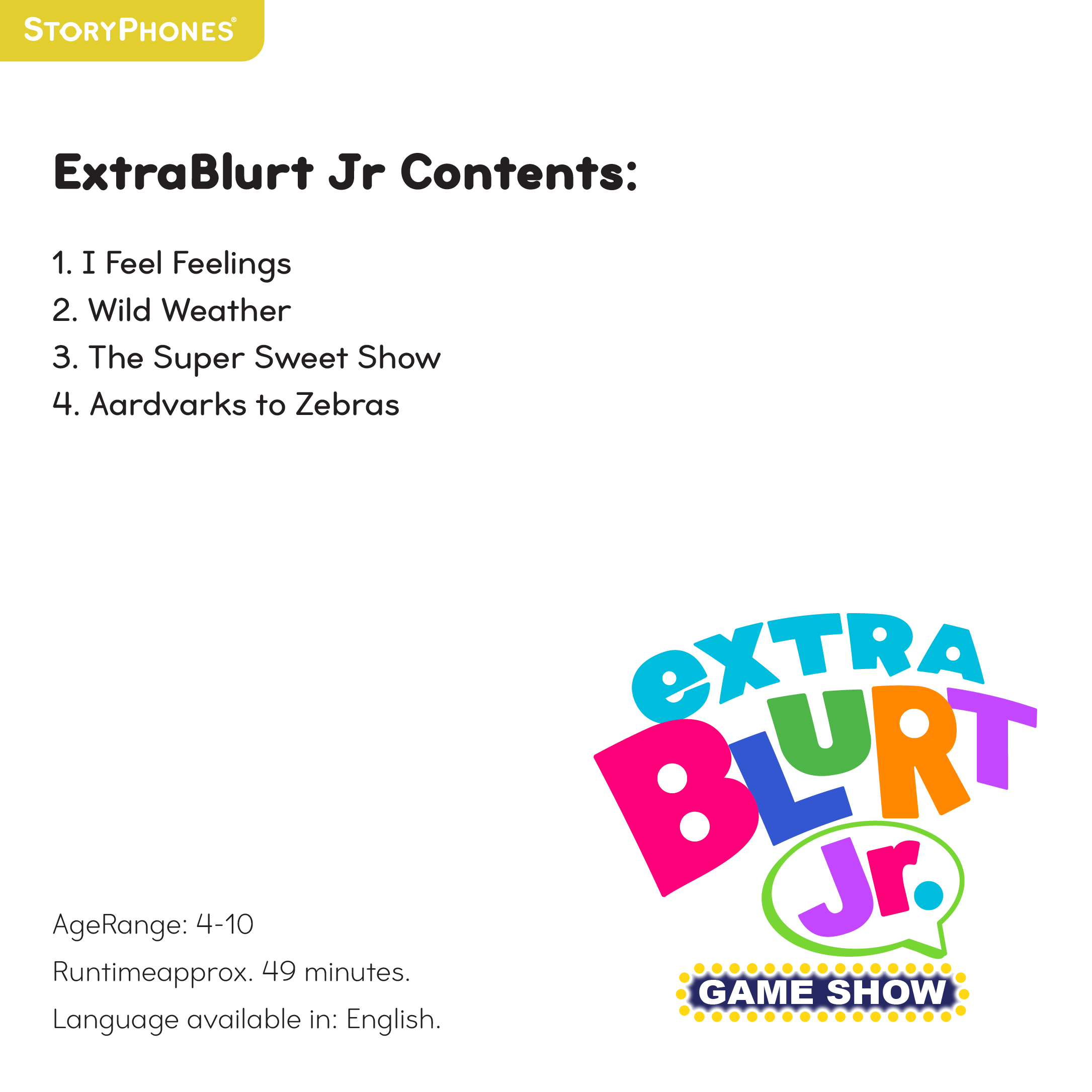 Play along with ExtraBLURT Jr., a show packed full of games for everyone. In each episode, hosts Natalie and Ezequiel invite you to shout out your answers in a variety of games based on a unique topic. Explore feelings, unwrap candy, and dive into an animal extravaganza, and more! Discover what you’ll blurt out when you play ExtraBLURT Jr.!
