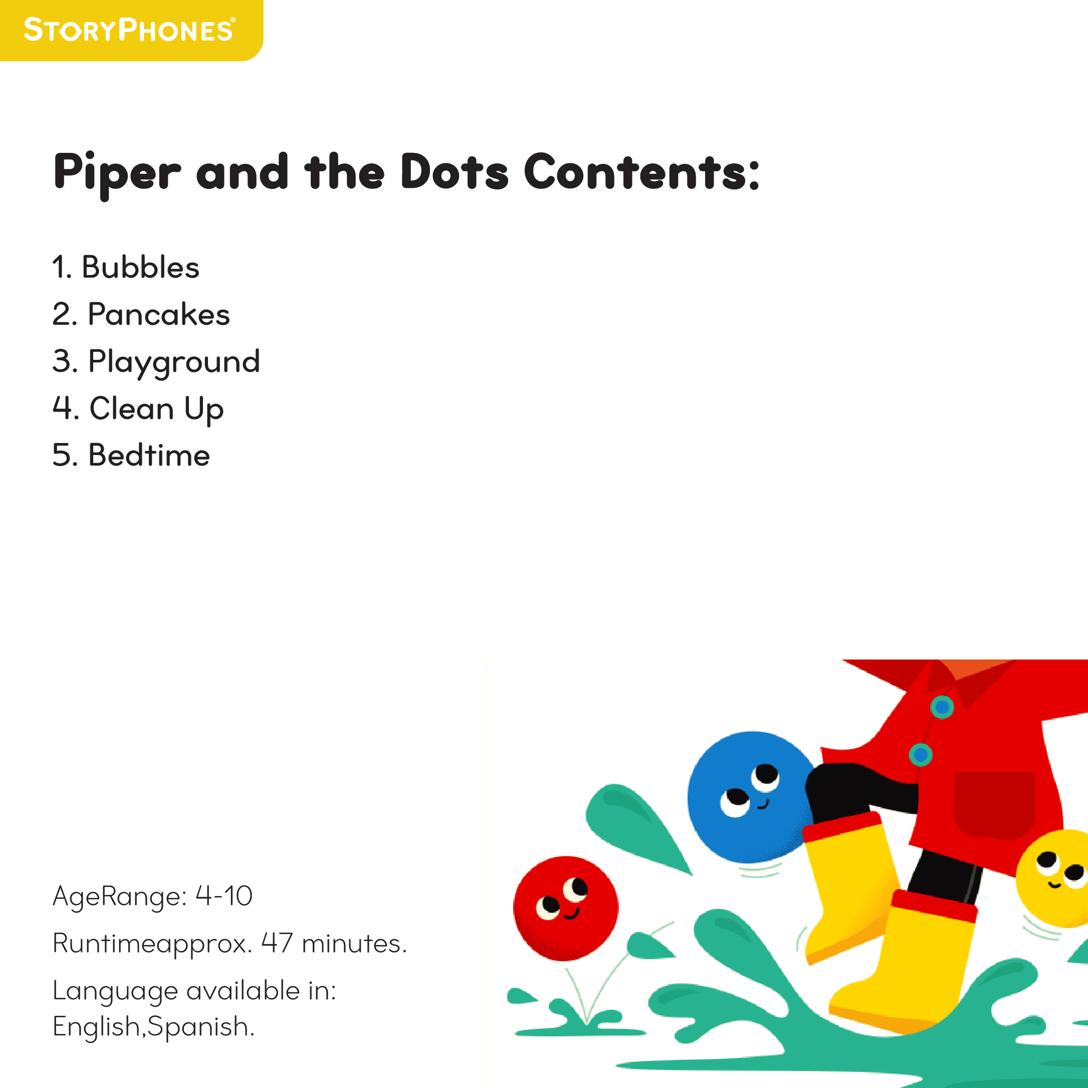 Join a playful preschooler named Piper and three musical Dots as they joyfully find adventure around their home and neighborhood. Get ready to splash in the bath, skip through a sprinkler, and sing with a songbird as you tag along on an interactive, musical playdate with Piper!