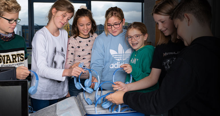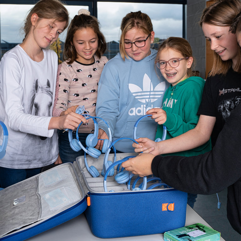 The StudyCase provides convenient storage for up to 14 StudyPhones jr, ensuring easy organization and accessibility of audio resources in educational settings.